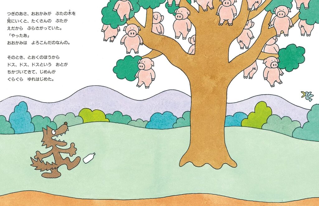 さてさて、ぶたがたわわに実った木の下で、おおかみが喜んでいたのもつかの間。なんとその日は、ぞうのマラソンたいかいの日だったんでございます! ドスンドスンとぞうたちが走るもんですから、ぶたの木がゆっさゆっさと揺れて、せっかくのぶたたちがポトンポトンと落ちてしまった! しかも、落ちたぶたはぞうのマラソンにくっついて走っていっちまったんですな 。