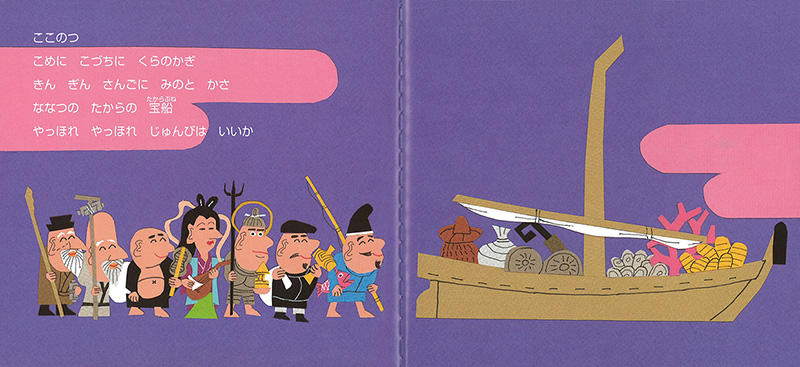こうやって一人ずつ、リズム良く紹介されていくんだね。五人目の布袋(ほてい)さまは『いつもにこにこ』だし、六人目の福禄寿(ふくろくじゅ)さまは『あたまも ながい』って…あはは、確かに長い!