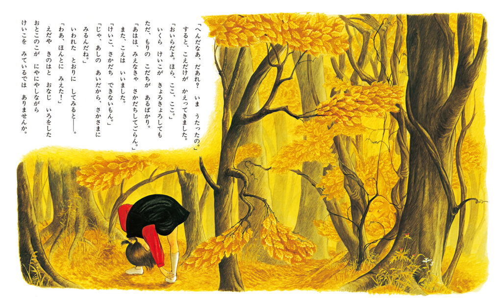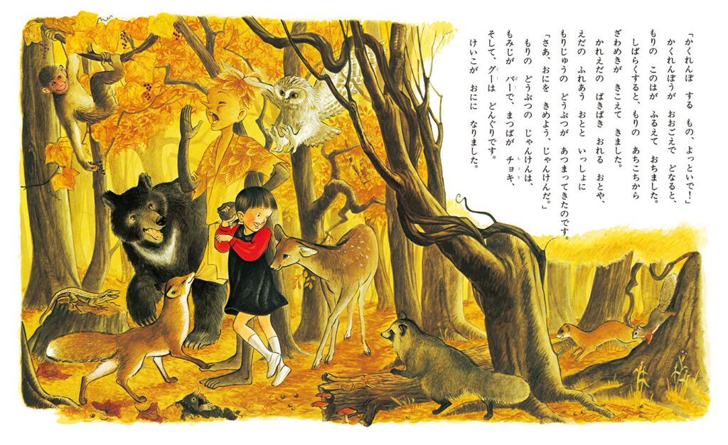 あのジャンケン、いいですよね。『もみじがパーで、まつばがチョキ、そして、グーは どんぐり』 って。すごく詩的で、秋の森ならではの発想だ。