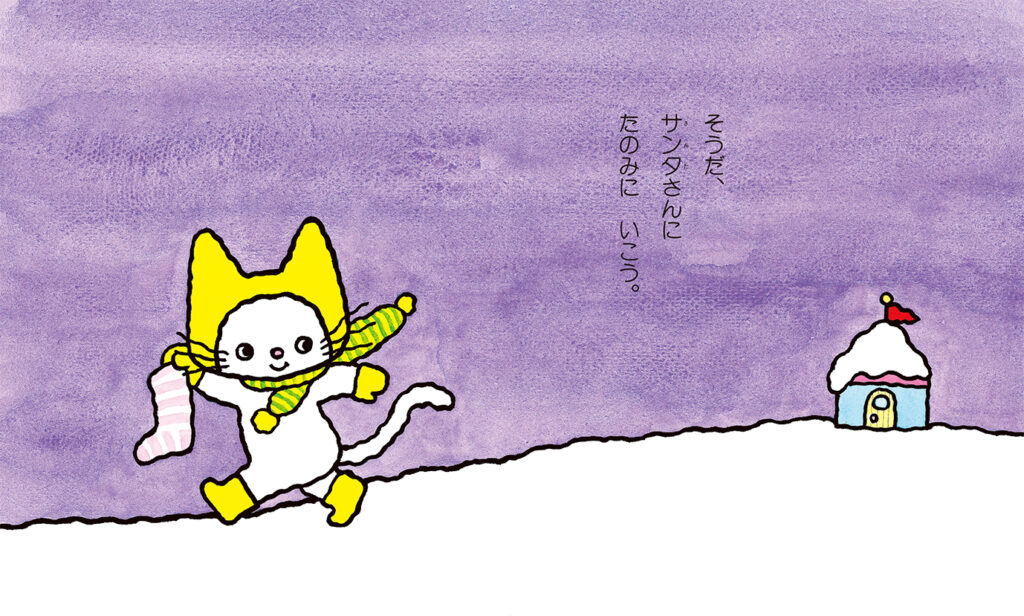 空いっぱいに飛びかう、いろんなサンタクロースたち。ノンタンは、ねこのサンタにプレゼントをたのみたいのに会えません。