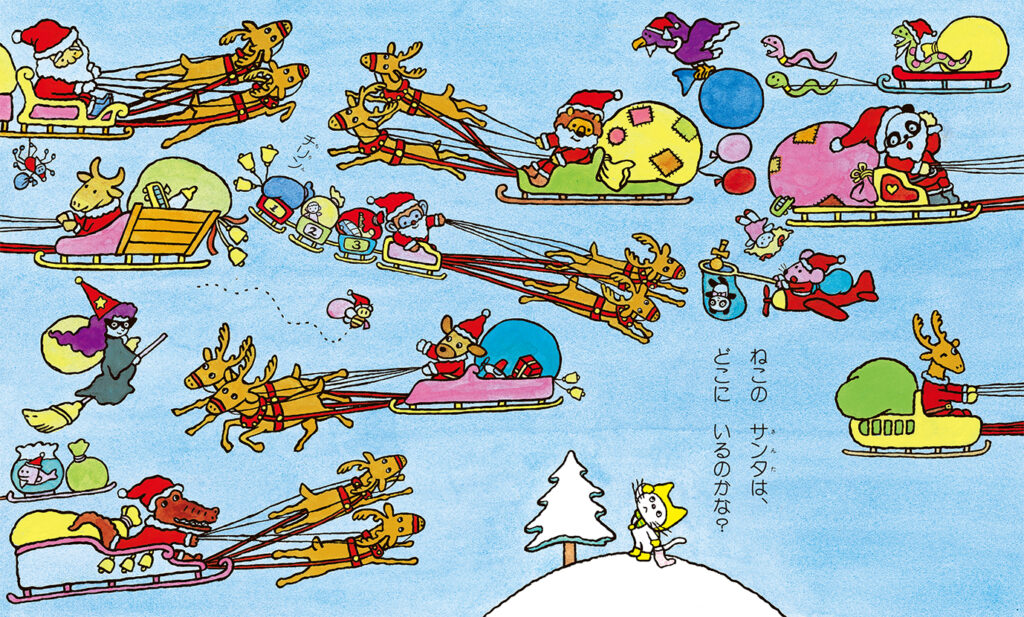トナカイのソリだけじゃないんだ。 ゾウのサンタ、ワニのサンタ、カエルのサンタ……。 しかも、見てみろよ。車に乗ってる奴もいれば、電車に乗ってる奴もいる!