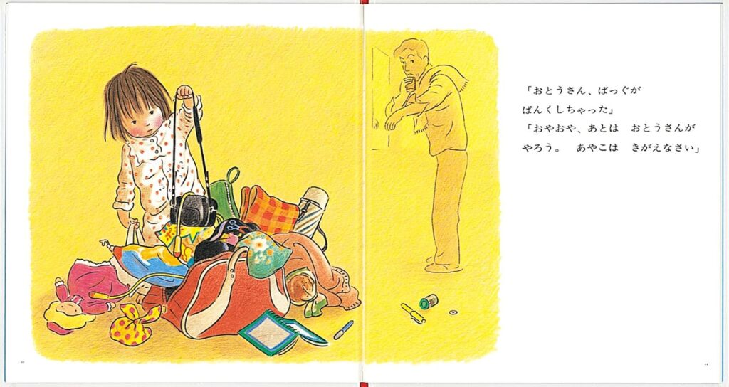 さぁてお次は、ひげを剃っているお父さんのところへ。パカッと口を開けたカバンを見つけるってぇと、『しめてあげようっと』と小さな手で無理やりファスナーを引っ張るんですがね。……えぇ、ご想像の通りでございます。綺麗に詰まっていた荷物が、あっという間にわやわやの大惨事ってぇ寸法です。