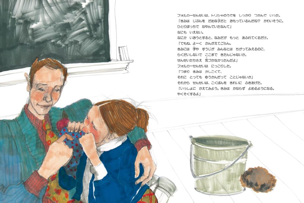 フォルカー先生、本当に最高だよね。トリシャの素晴らしい絵の才能を真っ直ぐに褒めてくれて。しかも、いじめる子たちには『人をばかにするほど自分がえらいと思っているのかい?』ってピシャリと叱ってくれるんだ。
