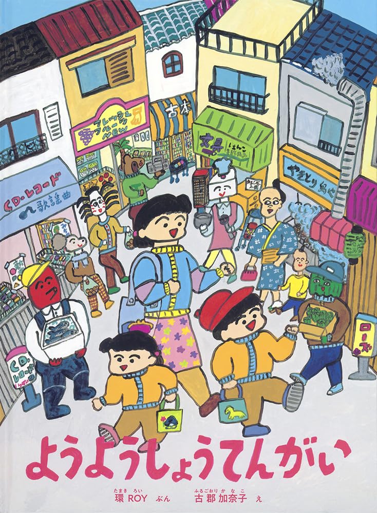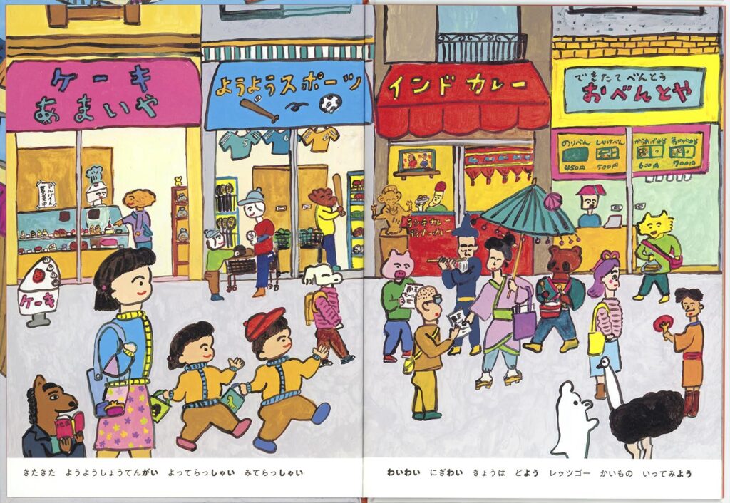 さてさて、この絵本。ページをめくるだけで、商店街のざわめきが聞こえてくるようでございます。ちょっと読んでみましょうかね。『きたきたようようしょうてんがい よってらっしゃい みてらっしゃい わいわい にぎわい きょうは どよう レッツゴー かいものいってみよう』……おや? なんだか不思議な調子ですな。